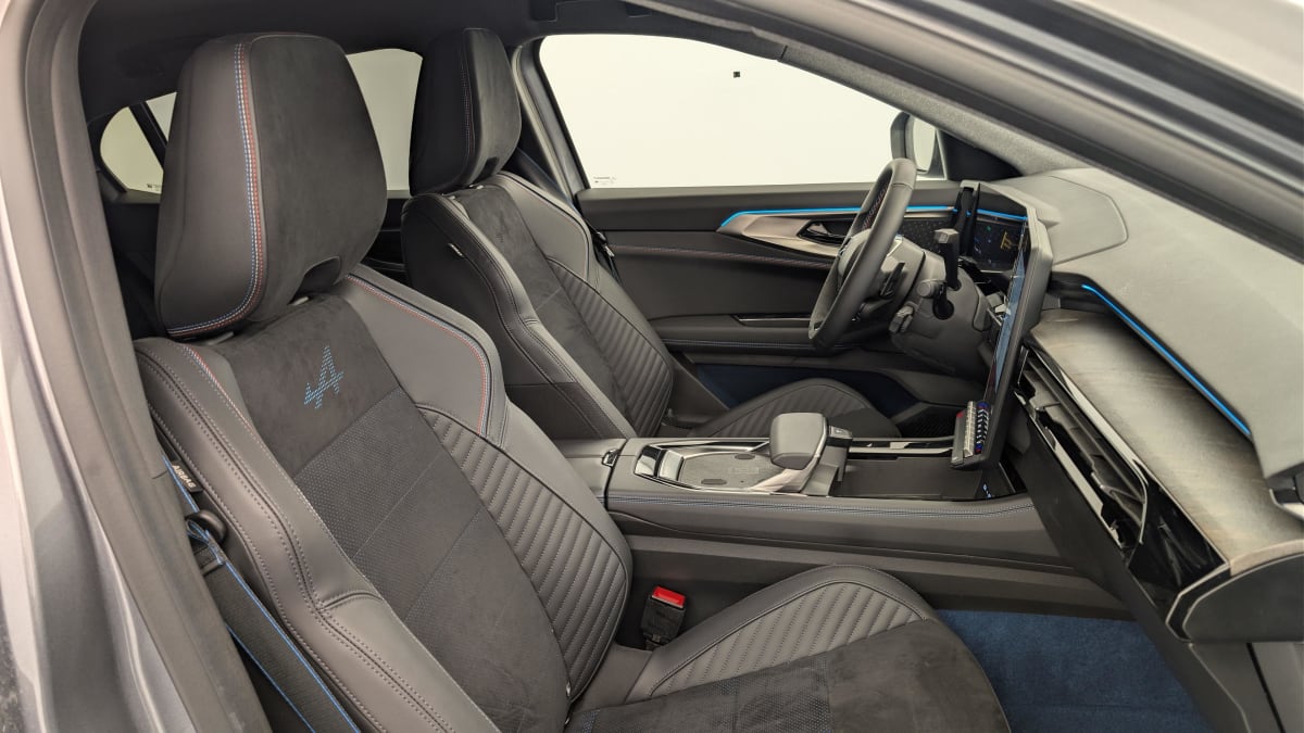 sellerie mixte alcantara avec surpiqûres bleues et logo alpine lumineux