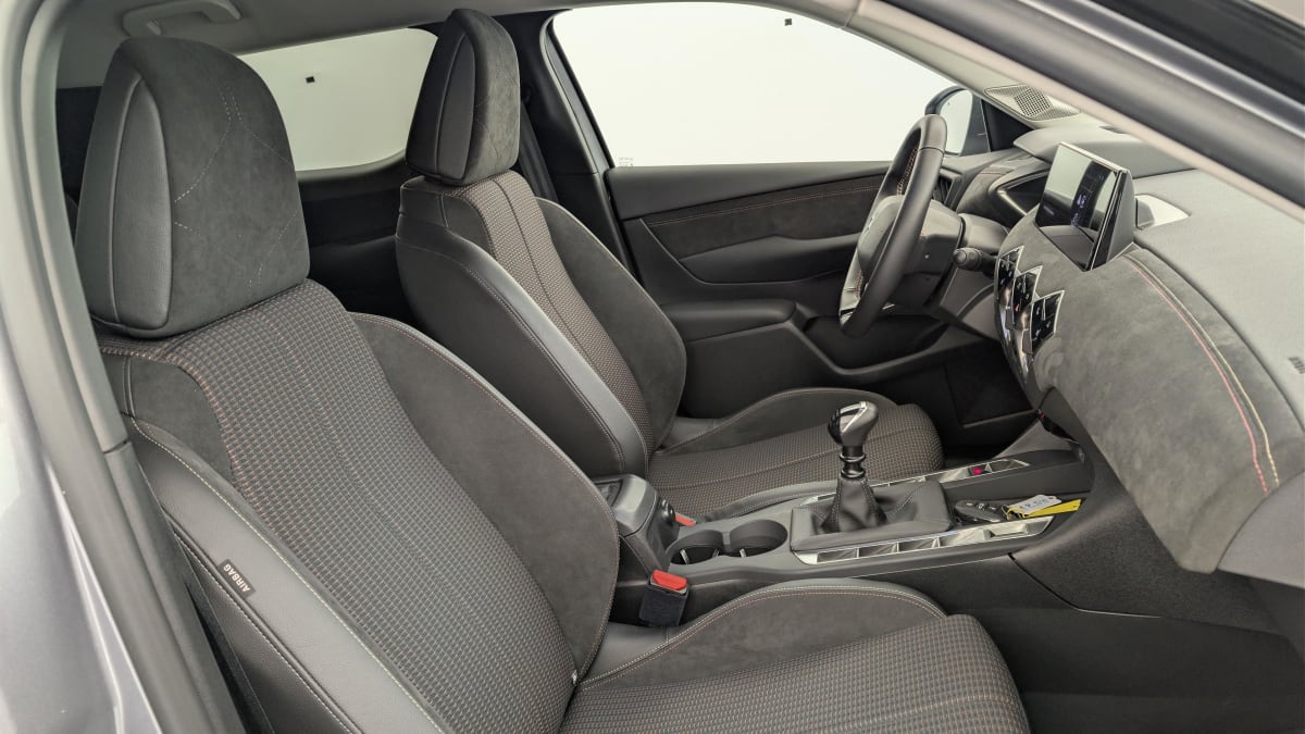 intérieur alcantara noir : ciel de pavillon gris galet volant cuir fleur perforé et coutures or et carmin décor alcantara noir siège tissu tressé basalte avec alcantara