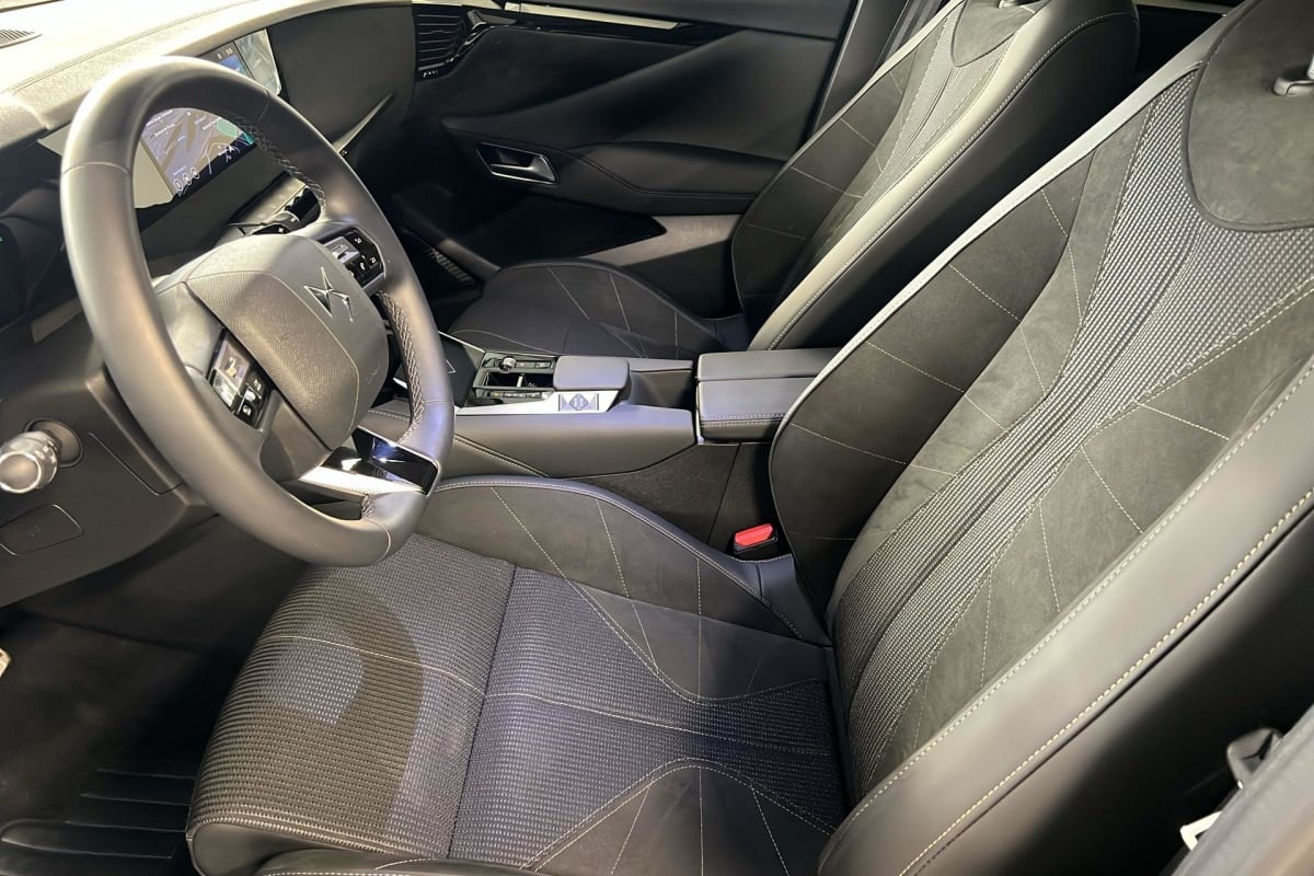 intérieur alcantara noir : planche de bord en alcantara ciel de pavillon clair sellerie en tissu tressé basalte avec alcantara et toile ds décors de panneaux de porte chrome guilloché volant cuir fleur mistral console en toile ds noir basalte panneaux de porte en alcantara et toile ds noir basalte