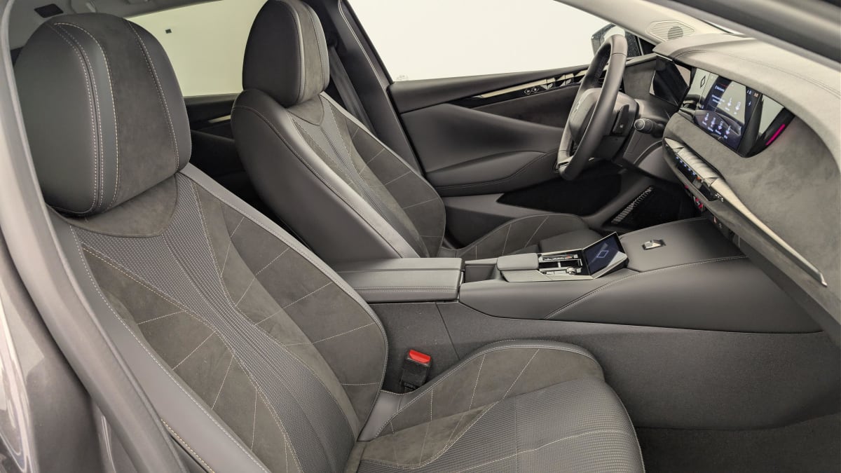intérieur alcantara noir : planche de bord en alcantara ciel de pavillon clair décors de panneaux de porte chrome guilloché volant cuir fleur mistral console en toile ds noir basalte panneaux de porte en alcantara et toile ds noir basalte sellerie en tissu tressé basalte avec alcantara et toile ds